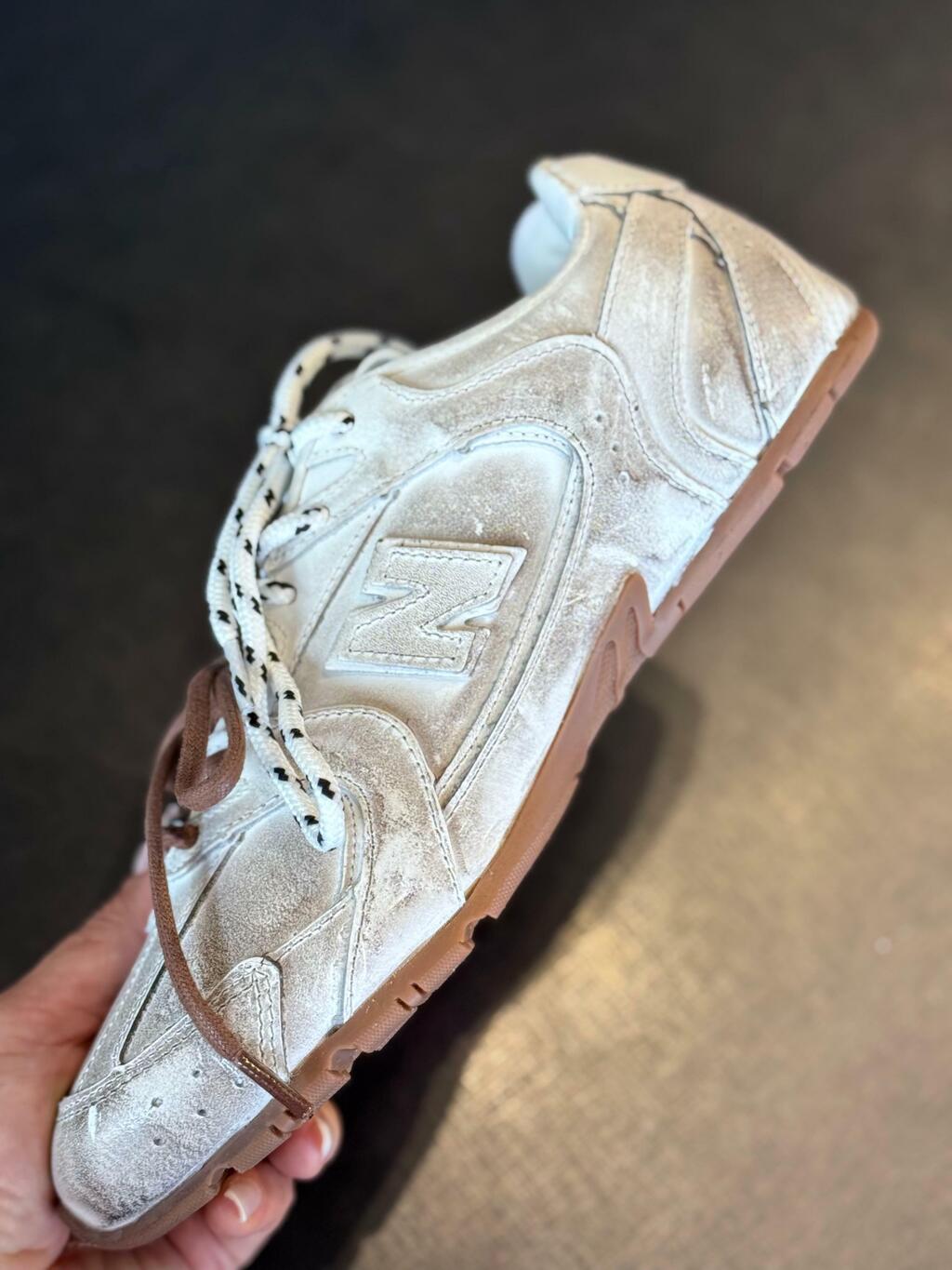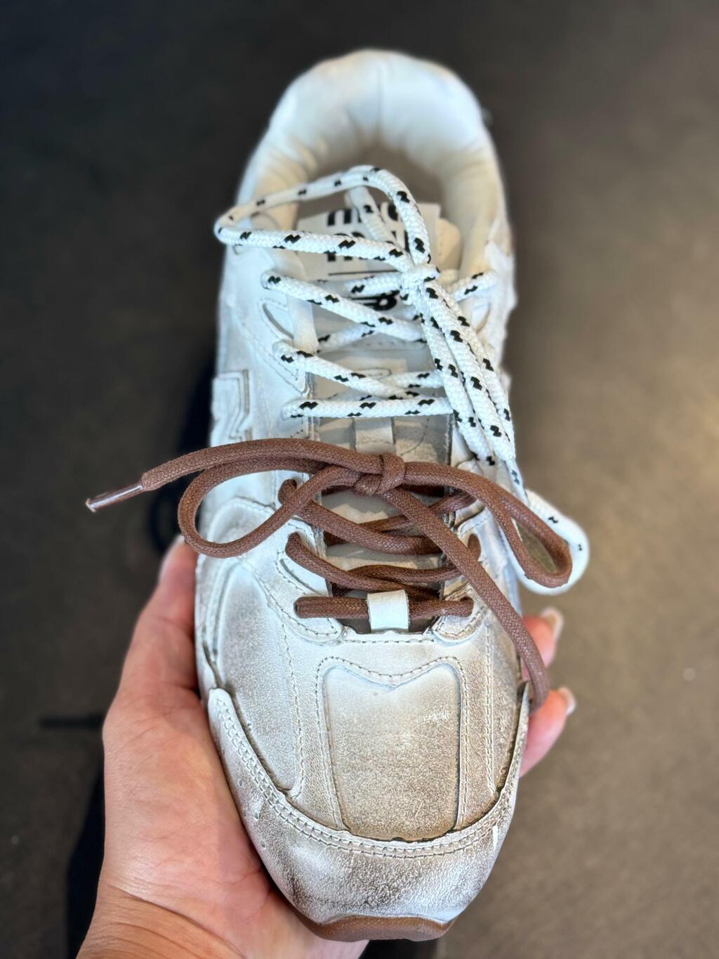 Este modelo exclusivo é o resultado entre uma colaboração entre Miu Miu e New Balance. Miu Miu renova completamente a estrutura, fazendo-o ultra leve, e brinca com o contrates entre cor e textura dos cadarços. O logo completa o desing com seu sinatura icônica.